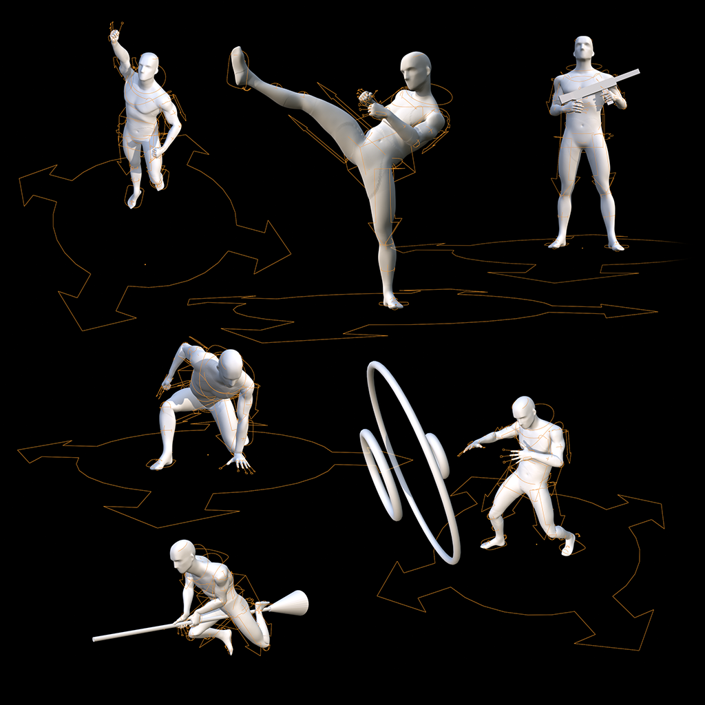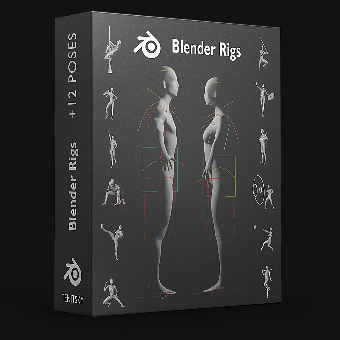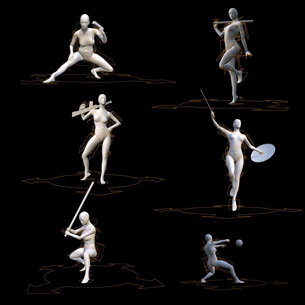 - Blender scene with 12 individual poses (each with editable rig)
