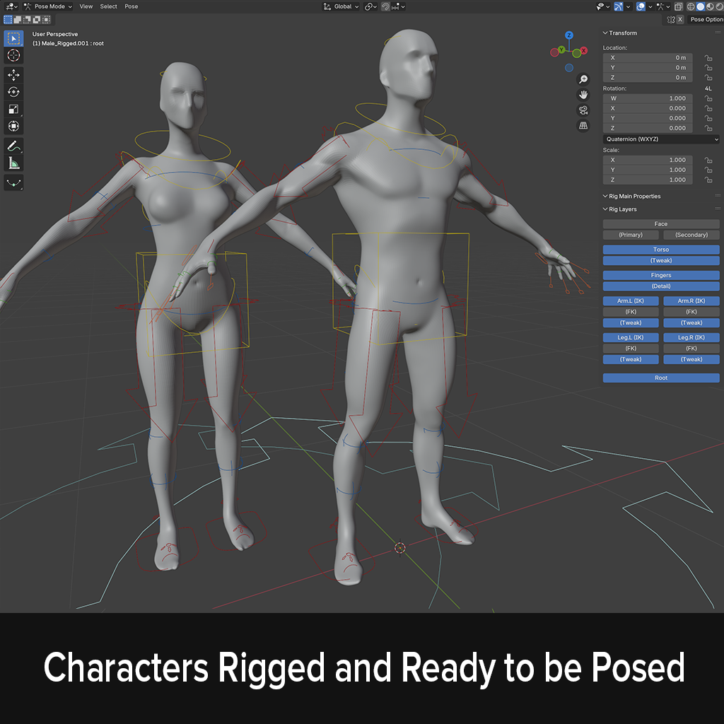 Fully rigged male and female characters, each with 12 dynamic, editable poses - ready to drop into your Blender scene or use as a base for AI workflows. Whether you're blocking out a scene, testing silhouettes, or feeding references into AI, these rigs save time and keep you flexible.